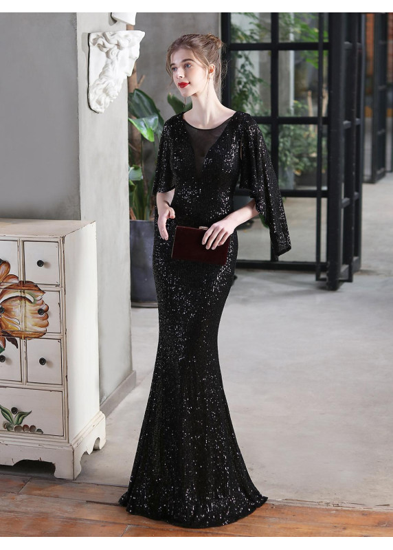 robe de soirée moulante et scintillante en sequins avec manches drapées