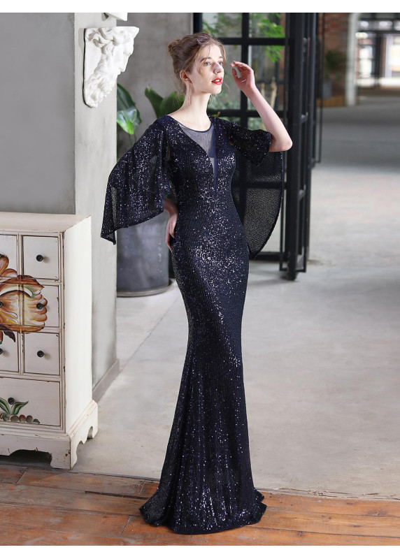 robe de soirée moulante et scintillante en sequins avec manches drapées