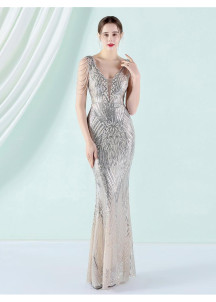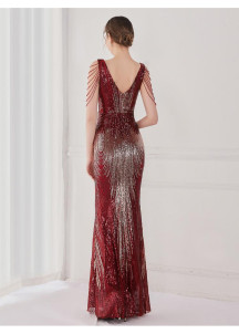 robe de soirée design moulant recouvert de sequins avec franges de perles