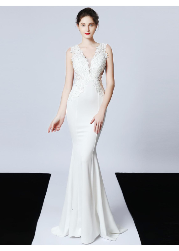 Robe de soirée sirène en satin champagne ornée d'une dentelle raffinée