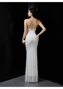 Robe de soirée fourreau blanche ornée de raffinés volants