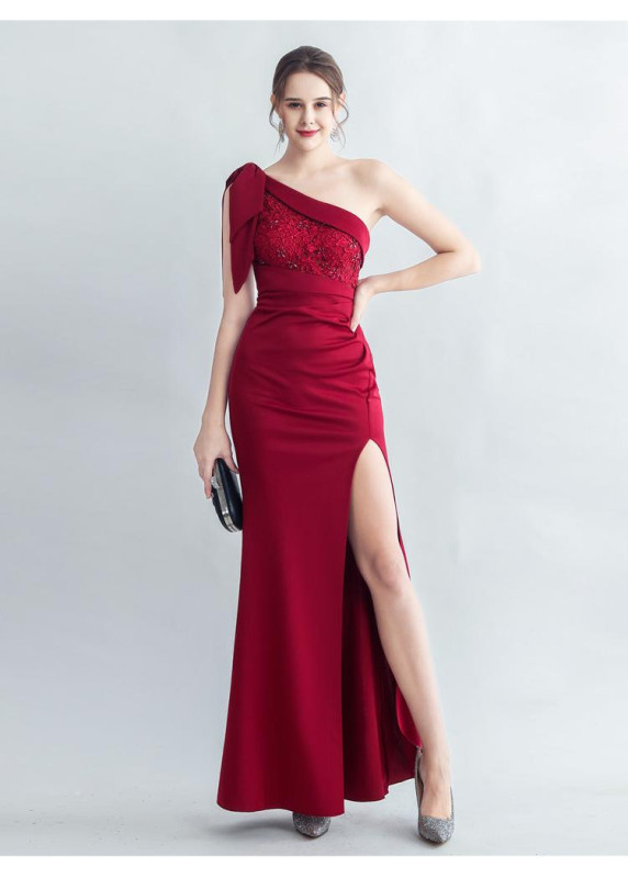 Cette robe de soirée d'un bleu soyeux épouse les courbes avec élégance, rehaussée par une touche de dentelle qui scintille sous les projecteurs. La découpe asymétrique de l'épaule ajoute une note de sophistication, tandis que la fente sur le côté révèle subtilement les jambes de la porteuse. Cette tenue est parfaite pour une soirée glamour, reflétant le style et la confiance de celle qui la porte.